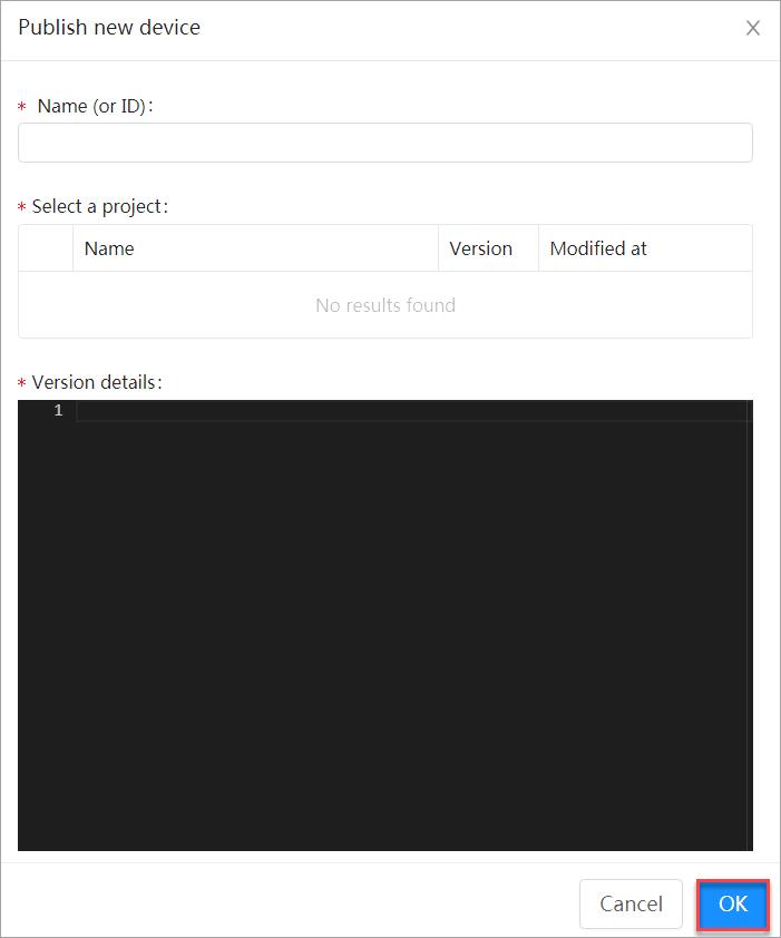 - In the dialog box that appears, enter the name or ID of the device to be published, select the project, and click OK.
