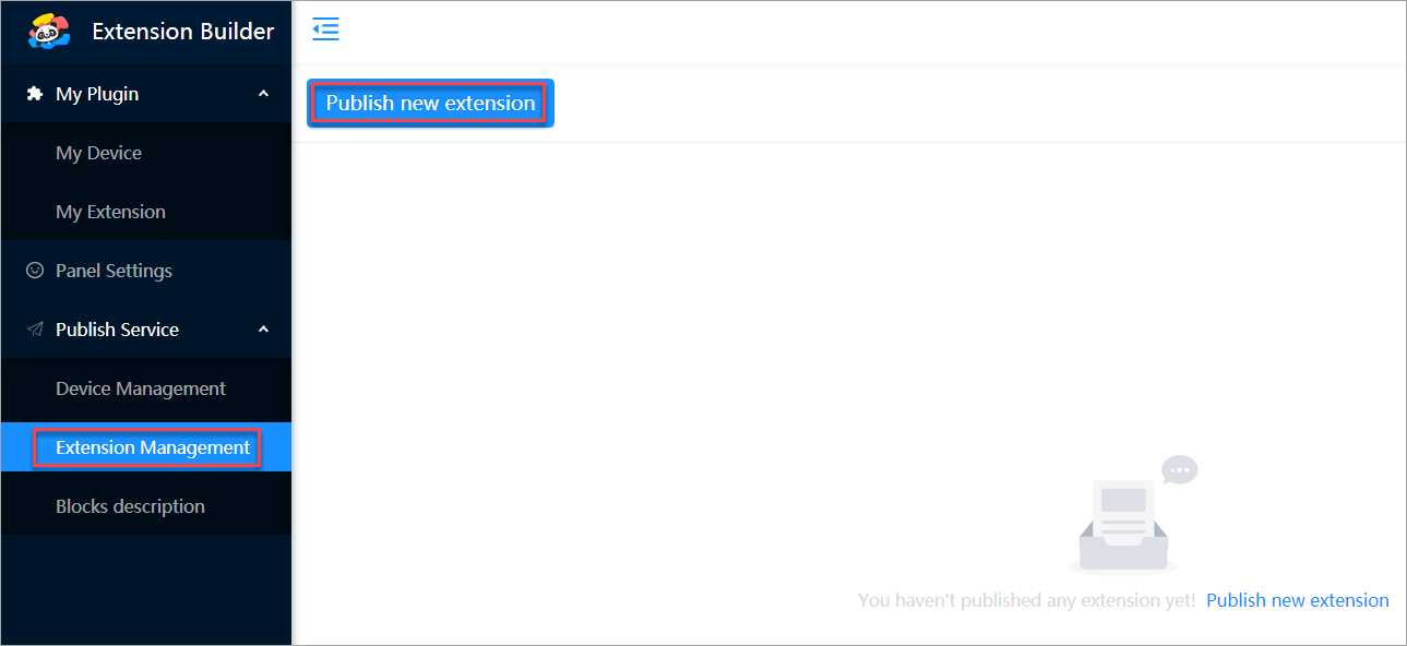 1. Choose Publish Service > Extension Management and click Publish new extension.